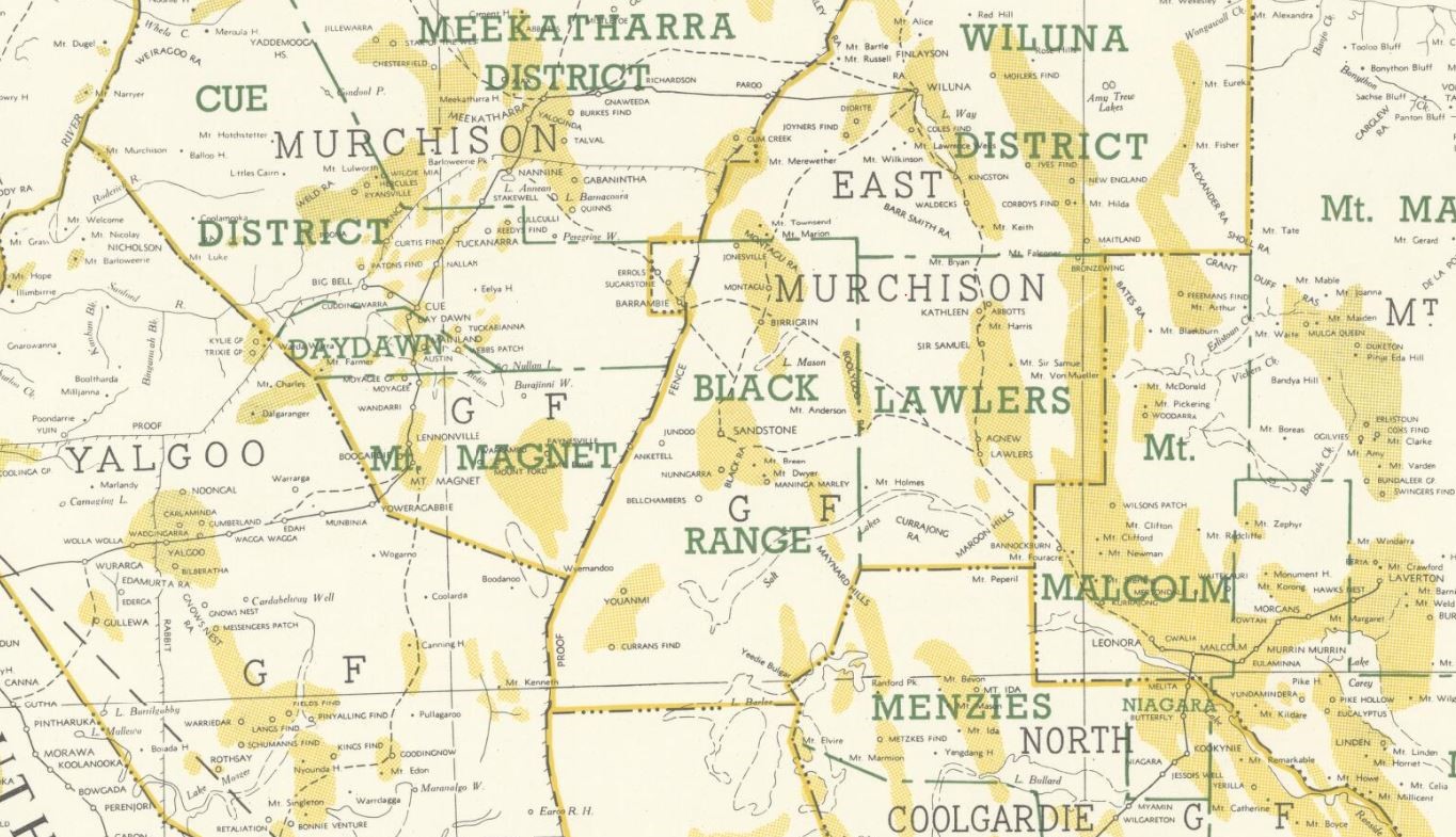 - Western Australia goldfields, 1958. Shows state-wide goldfields, districts and gold bearing areas.