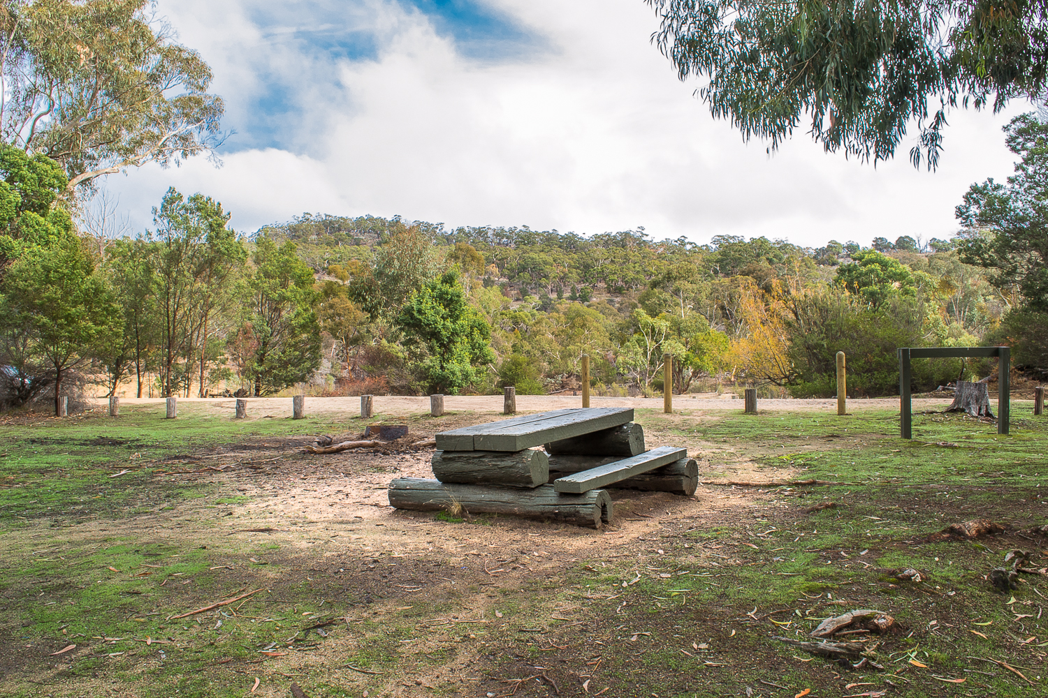 The campground features picnic tables, wood fire barbecues, bins, toilets, and water taps along the back of the toilet block. There is also a large undercover area with a concrete floor located separate to the picnic area.