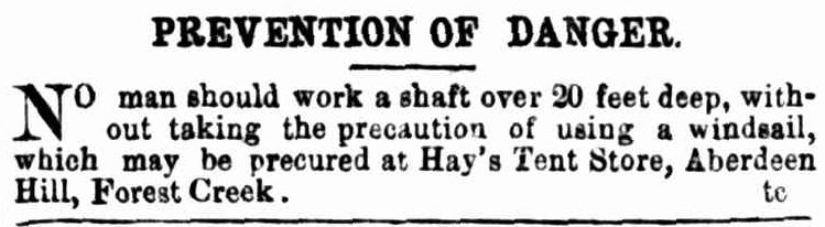 Prevention of danger! A great incentive for diggers to purchase windsails from Hay's Tent Store at Forest Creek. The following advertisement was published in 1858: