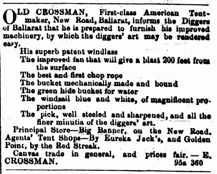Old Crossman, an American Tent-maker, placed an advertisement for his products in The Age in 1855.