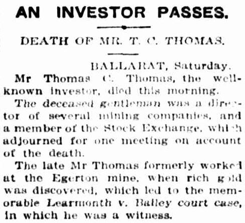 It was considered a remarkable coincidence that gold should be discovered in the final resting place of Mr. Thomas, who was one of the leading mining investors of Ballarat for many years, and he had taken a prominent part in developing the golden resources of the famous Egerton and Berringa districts.