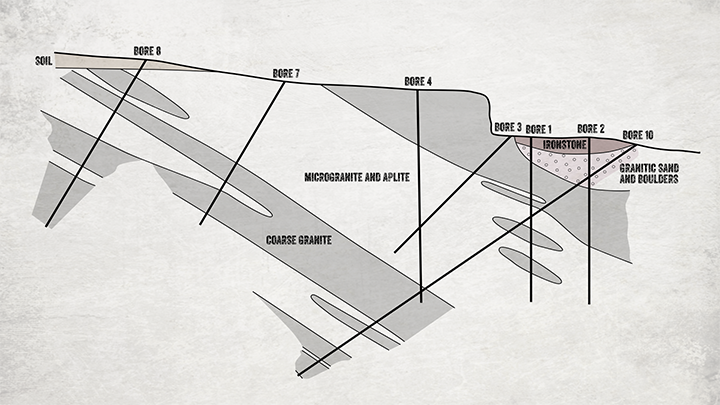 Tests of the bore holes reveals varying levels of radio activity, but the only traces of ore mineral in the cores were small concentrates of pyrite.