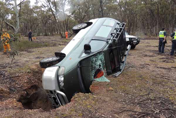 A woman was lucky to escape unharmed when she accidentally drove her vehicle into an open mine shaft in the bush outside Maldon. Image source: CFA News, Oct 2018