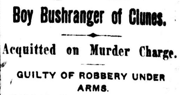 "I was 17 years of age on September 21, 1921. On June 9 I told my mother I was going rabbiting. I took my rifle and 23 cartridges, also a sugar bag, loaf of bread, bottle of sugar, a half pound tin of cocoa, and a 7lb bag of oatmeal, a small spirit stove and a bottle of methylated spirits, and a change of clothing. I took the provisions into the bush. I returned to Clunes with my rifle fully loaded. I had three drinks of beer at Wrathall's hotel. I went to the office of the knitting mills and asked to see Mr. Schempp, the manager, as an excuse to see if the employee's pay had been taken out of the safe. As I did not see any money on the table in the office, I went to the park to pass the time away. When I returned I had my rifle while I took the money. I left with the money and proceeded across the street to Mr. Greenhalgh's tobacconist shop and smashed the shop window with the stock of my rifle and took a watch. I then saw Mr. Schempp and Mr Exelby emerging through the front gate of the mill. I pointed the rifle at them. They ran up the lane and I fired twice. I did not see Mr. Cuttle standing at the gate that day. I looked round and saw Schempp standing at the gate. I pointed my rifle at him several times and he stepped back each time out of sight. On the way out I met Mr. Thompson and gave him 2/ to take a note to the mayor of Clunes. I did that to make the public believe that I had gone bushranging. I knew the pay-day at the mill and about the time it would be on the office table. I expected to get about £200. The only person I have a grievance against at the mill is Mr. Wingate."