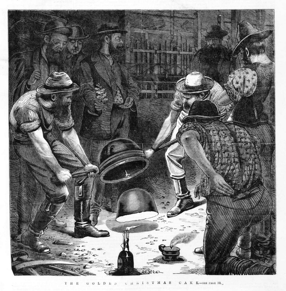 On the goldfields the mining companies generally endeavor to have a large crushing for Christmas, and turn out their golden Christmas cakes for exhibition in the windows of the local banks to the admiring gaze of hundreds. The frontispiece to this number depicts most accurately a scene where the golden cake has just been dropped from the retort. Our artist has well illustrated the event, and the engraving will supply our readers who have never been upon the goldfields with a truthful sketch of this in interesting operation. 'Tis not the traditional plum pudding of the old Christmas days, but it is one far more valuable, containing locked up within its golden grasp the means which rightly used will help to impart comfort and material prosperity through the length and breadth of the land. A cake which was exhibited the other day in the window of a jeweller's shop in Melbourne, weighed 3764 oz., and was worth £15,026. This cake was the result of the last crushing made by the Great Extended Hustler's Tribute Company, Sandhurst, and is said to be the largest cake of gold ever produced in Victoria.