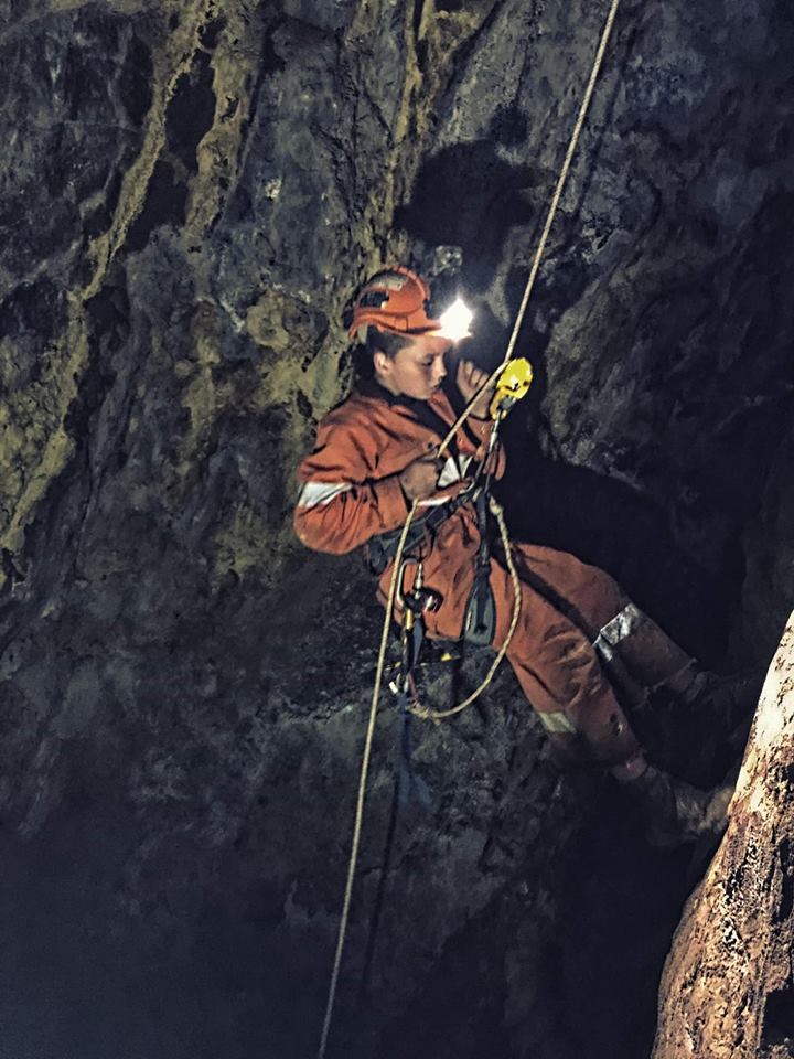 He's been exploring the underground for the last 5 years with myself. He then wanted to start to learn how to climb and go down to the deeper levels. We bought him some gear and he was off and running. To be honest he's turning out to be a great climber.